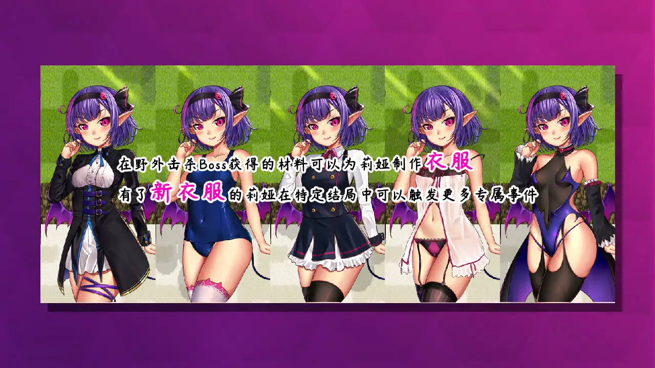 通过击杀魔物Boss可以得到特殊的合成素材,这些素材可以制作出各式各样的衣服来帮莉娅替换服装。